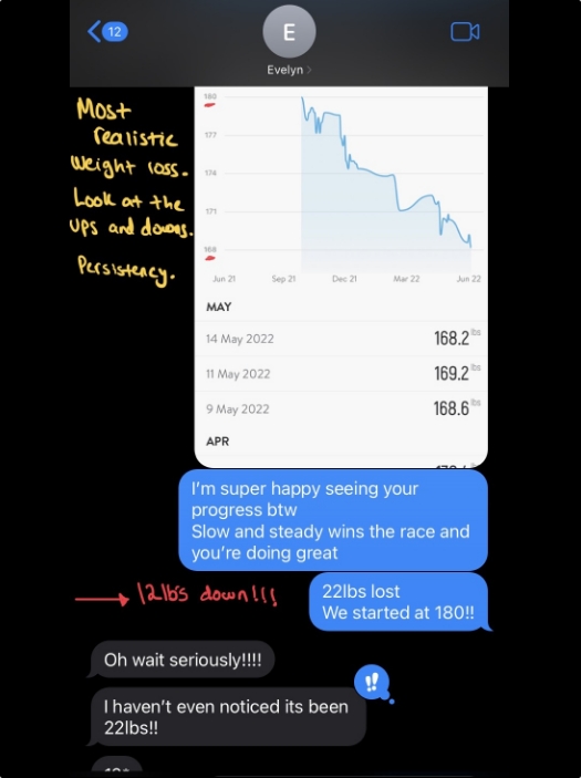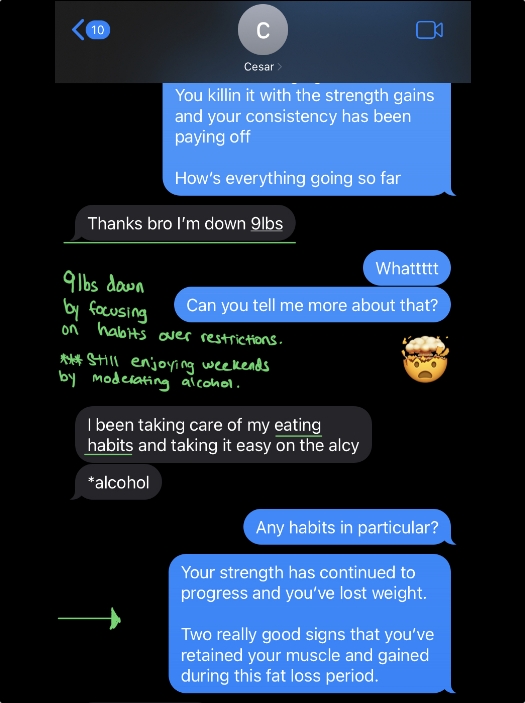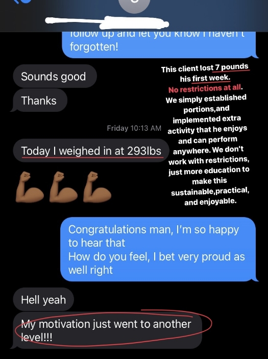 With his guidance I have been able to set realistic goals and meet them, allowing me to quickly and confidently move through each phase of my body transformation. He is also always available via text or email which makes it easy to communicate between sessions.